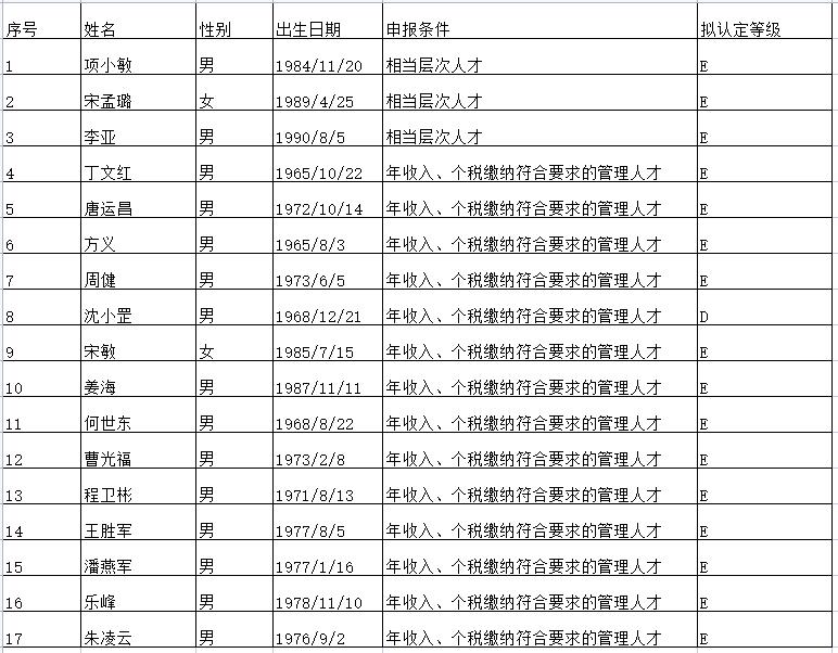 项小敏等17名同志(所属部门:巢湖市人力资源和社会保障局;工作单位:安徽太阳集团网址高新材料股份有限公司)经审核,拟申请认定合肥市重点企业高层次人才。