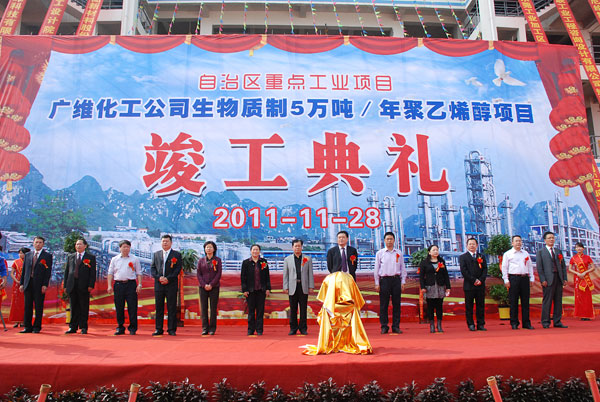 自治区工业和信息化委员会张北玉副处长在致辞中说,广维化工公司生物质制年产5万吨聚乙烯醇项目是自治区重点建设项目,项目竣工是我区经济建设中的件大喜事,对加快我区石化产业结构化升级,推进循环经济建设,做强做我区工业,拉动地方经济发展,具有十分重要的意义。希望广维化工加快前端项目——年产5万吨酒精制乙烯和10万吨醋酸乙烯项目建设,尽快形成完整的循环经济产业链;同时科学安排生产,加强节能降耗和环境保护,不断拓展市场,努力把项目建设成为化工行业循环经济的典范。