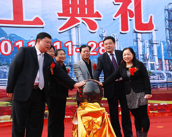 在河池市委常委、统战部部长徐钦恒宣布广西广维化工公司年产5万吨生物质制聚乙烯醇项目竣工后,徐钦恒、吴福胜、吴胜梅、奉海峰、张北玉共同触摸水晶启动球。顿时,现场礼花绽放,鞭炮齐鸣,音乐响起,林立的高塔在阳光的照射下更加显得气势如虹。