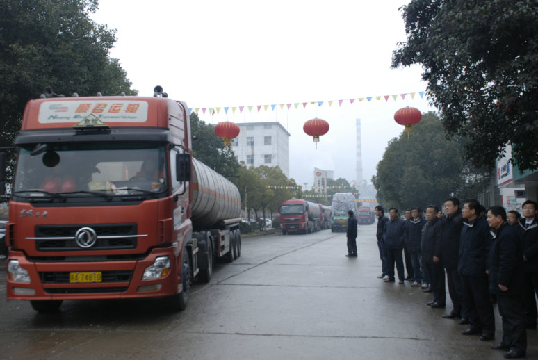 ?1月30日(年初八)上午,物流公司举行发车仪式。8:18分,18辆货车满载公司8个品种的产品,徐徐开出公司大门,驶向全国各地。集团公司董事长吴福胜、股份公司总经理季学勇等公司导为新年次出征的车队送行。吴福胜发表简短祝词,祝车队路顺风,祝太阳集团网址龙年大发。 (方华? 摄影报道)