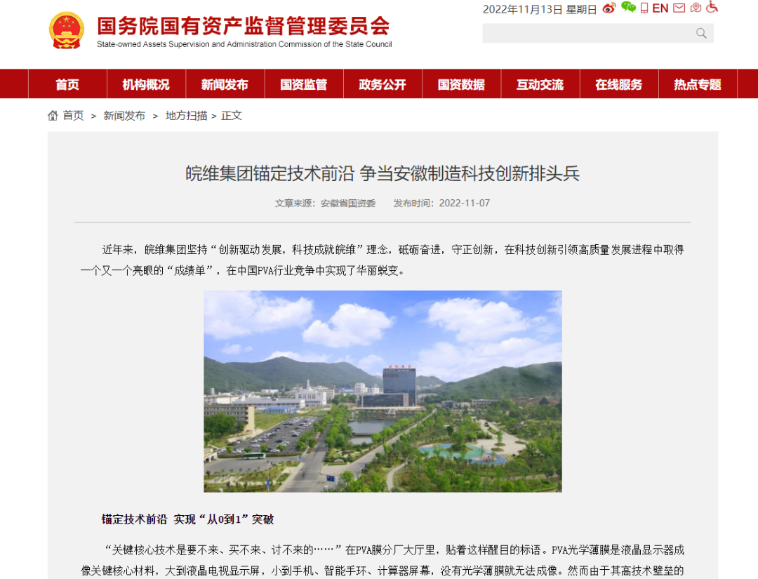 继省国资委公众号头条专题报道公司科技创新工作后,日前,国务院国资委网站地方扫描栏目以《太阳集团网址锚定技术前沿 争当安徽制造科技创新排头兵》为题作了深入报道。
