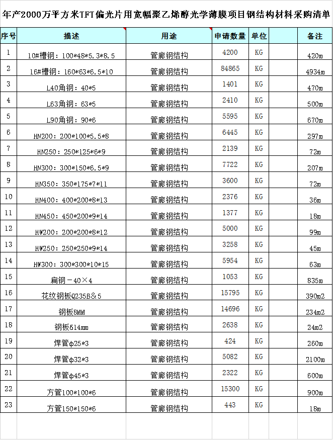 2、项目名称:年产2000万平方米TFT偏光片用宽幅聚乙烯醇光学薄膜项目钢结构材料采购